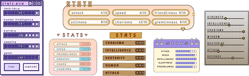 | 🌼 stats panel (max 6 stats) | 🌼 inventory panel (max: 5 things) |