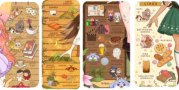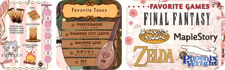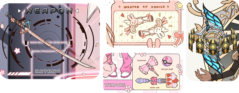 | 🌼 likes panel (max: 5 things) | 🌼 weapon(s) panel (max: 3 weapons) |